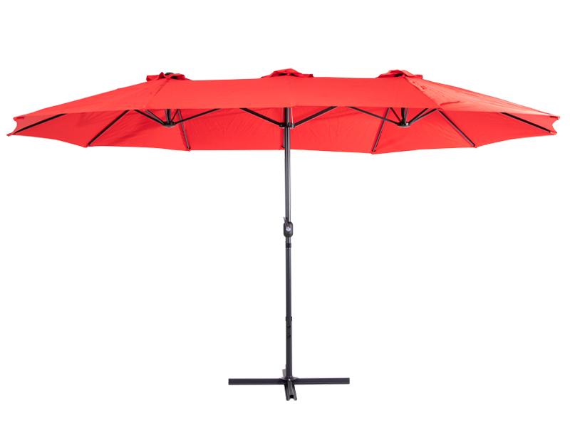Quitasol ovalado doble de 4.55 x 2.7 m, modelo "Twins", con 12 cascos de lona Poliéster UV impermeable de 180g. Contiene varas reforzadas de Acero recubierto de 12 x 18mm, asta de Acero recubierto de 48mm, sistema de apertura automático con manivela.