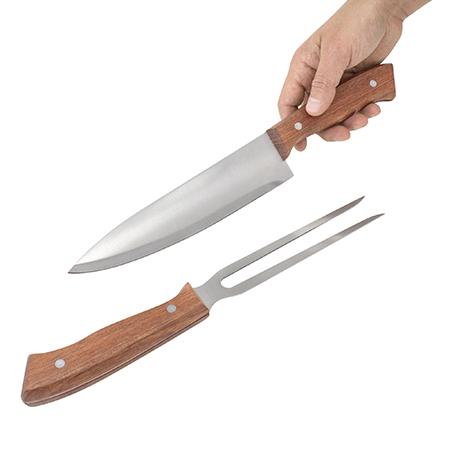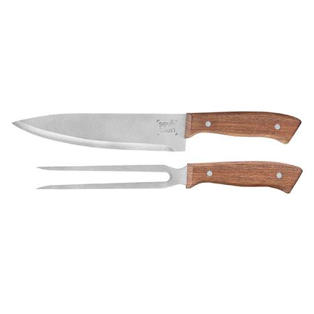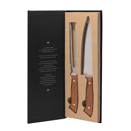 Set de 2 utensilios: Cuchillo chef de 33,5 cm y 175 g. Tenedor de 31,3 cm y 125 g., ambos con mango de madera. Presentación en caja de regalo estilo libro. Acero inoxidable 420 y Madera de Acacia