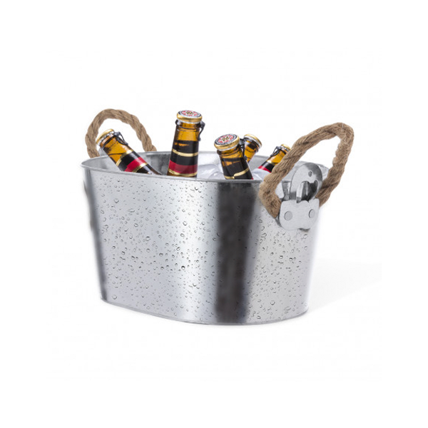 Fantástico cubo metálico de 6l de capacidad para conservar bebidas frías. Fusión perfecta entre estilo y utilidad por sus abridores fijos en los extremos y una gran capacidad. De diseño robusto, con asas de cuerda para fácil transporte. 6 L. Abridor Incluido