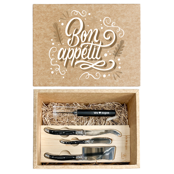 Descripción general del producto: Este kit está formado por Caja Medium, Set de Queso x3 Laguiole y Destapador Neumatico. ¡Elige tu combinación de colores y personaliza los productos y la caja con tu logo! .