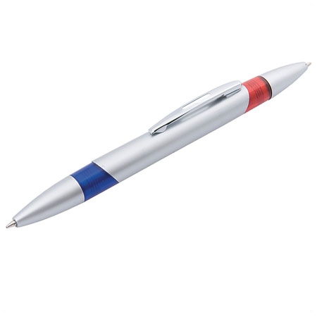 Bolígrafo plástico "Arco" con cuerpo de color metalizado. Escritura azul.
