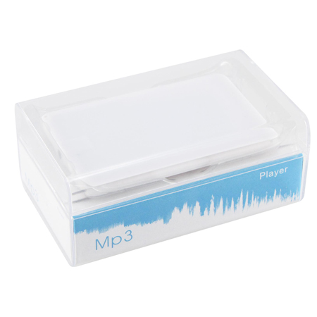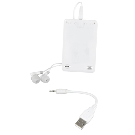 MP3 Player 8 GB, con forma de tarjeta de crédito blanca, amplia superficie para imprimir a todo color, incluye audífonos y cable cargador USB. Presentación en práctica caja acrílica transparente.
