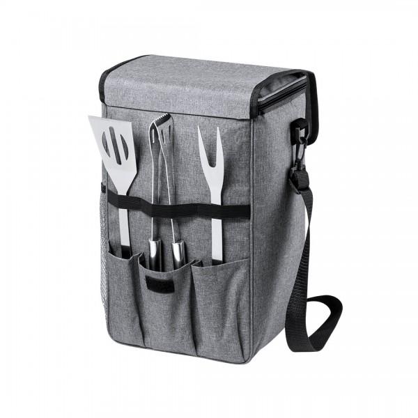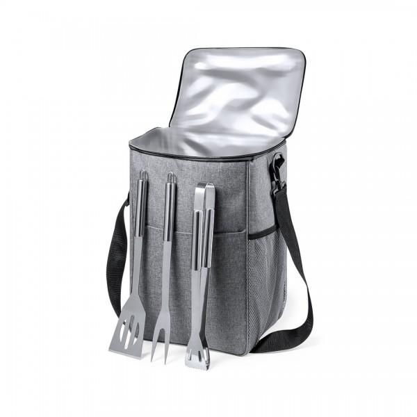Set de asado con 3 accesorios. Incluye: Bolsa de transporte/nevera fabricada en resistente poliéster RPET 300D, elaborado a partir de plástico reciclado, para así fomentar la reutilización de residuos plásticos y ayudar a la sostenibilidad del planeta. Con cinta para hombro ajustable de cierre de mosquetón e interior isotermo en PEVA, para conservar la temperatura de los alimentos. Distintivo RPET en etiqueta etiqueta exterior. Paleta, pinzas y trinchador metálicos, con mangos en color negro. 3 Accesorios