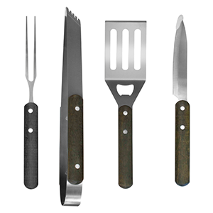36,5 x 11 x 5,2 cm. (medidas del estuche). 28,9 cm (medida del tenedor parrillero) 33 cm (medida de la pinza). 28 cm (medida de la espatula). 29 cm. (medida del cuchillo con protección plástica). Madera y acero inoxidable. Estuche con mangos que contiene accesorios para la parrilla: tenedor parrillero-Pinza para servir-cuchillo y espatula.