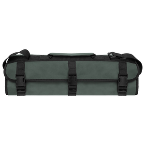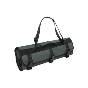 Polyester y acero inoxidable. Set para asador cuenta con tenedor asador, cuchilla de acero inoxidable, cepillo de aluminio, espátula, pinza, pincel, 4 pinchos para brochetas y 6 pinchos pequeños. Estuche de polyester con manilla y tres hebillas plásticas para cerrar. Tamaño: Ø 9 x 46 cm. (cerrado) 60 x 46 cm. (abierto).