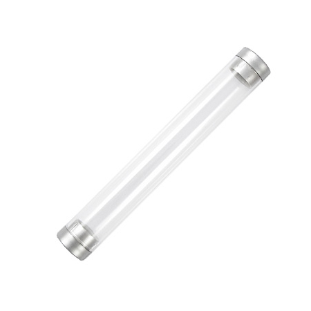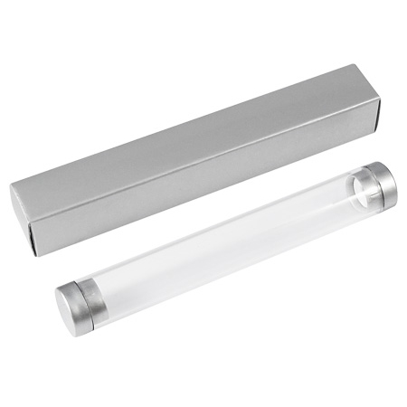 Tubo de Acrílico traslúcido para 1 bolígrafo. Tapas plateadas con superficie lisa. No incluye Bolígrafo.