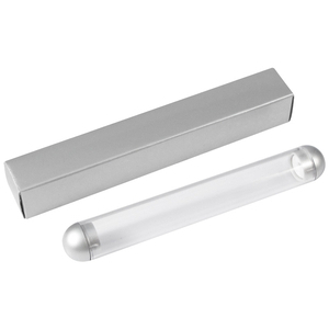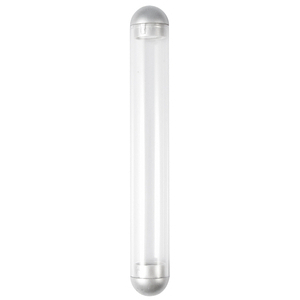 Tubo de Acrílico traslúcido para 1 bolígrafo. Tapas plateadas con superficie redondeada. No incluye Bolígrafo. Tamaño:15.8 x 2.1 cm.