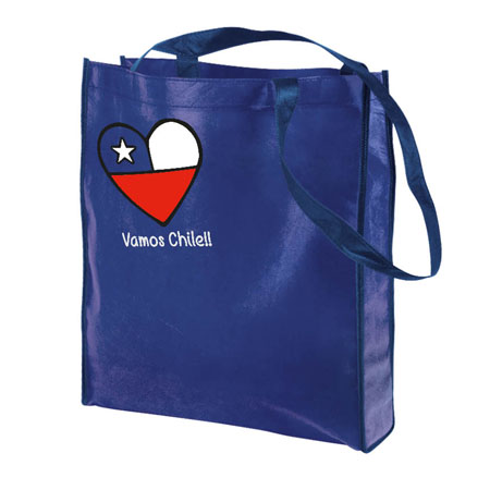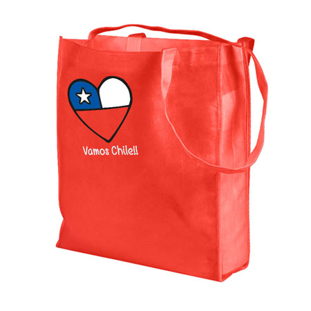 Vamos chilenos !!! A alentar a la roja de todos. Bolsa Ecológica "SHOPPING", en tela TNT, 100% reciclable y reutilizable. Cuenta con 2 asas de 60 cm. c/u aprox. Incluye impresión "Vamos Chile" a 3 colores en el frente. Tamaño: 32 x 40 x 12 cm.