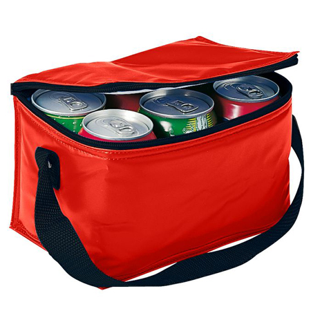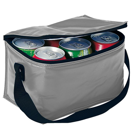 Cooler para 6 latas de bebidas o cervezas. Tela exterior 420D/PVC Poliéster. Tela interior PVC metalizado aislante.